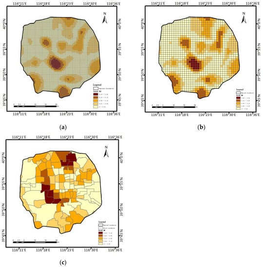 Spatial distribution of fitting degrees of urban housing price and blue–green space area proportion index; The pixel scale is 500 m (a), 1000 m (b), and city block (approximately 2000–20,000 m) (c), respectively.