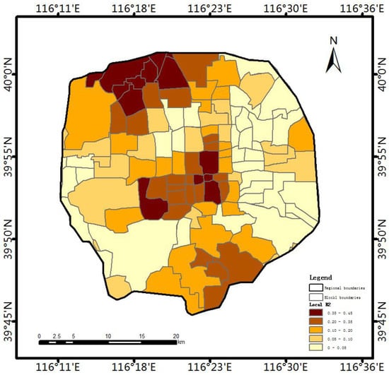The results showed that there was a positive correlation between the satellite remote sensing NDVI and green space area proportion index (), but the fitting degree of GWR decreased as the analysis scale increased. At the 500 m pixel scale, the adjusted fitting degree (R2 = 0.73) was the largest. At the 1000 m pixel scale, the adjusted fitting degree (R2 = 0.50) decreased. At the city block scale (approximately 2000–20,000 m), the adjusted fitting degree (R2 = 0.30) was the smallest. In general (Figure 7c), the regression effects of the satellite remote sensing NDVI and green space area proportion index () in the northwestern part of the city were the best. The southern part of the city had the worst regression effect. However, at finer scales, such as the 500 m scale shown in Figure 7a and the 1000 m scale shown in Figure 7b, the areas with better spatial fitting degree were distributed loosely in most regions.