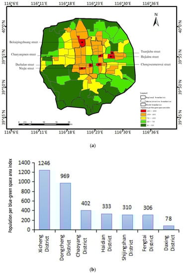Spatial distribution of population density per blue–green space area proportion index. (a) Spatial distribution in different city block; (b) Statistics in different distincts.