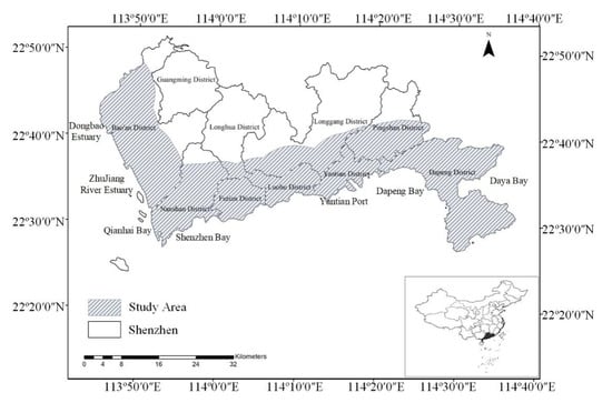 The Shenzhen coastal zone covers a 10 km buffer zone on the landward side of the coastline across the boundary with Hong Kong (this is a commonly used spatial range of coastal zone surveys in various countries, extending about 10 km inland [33]). The area of this coastal zone is about 1185.3 km2 and the coastline is about 457 km long.