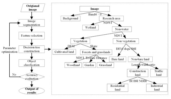 Detailed land cover classification is based on the extraction of a combination of spectral and textural features. NDWI (Normalized Difference Water Index, [37]), which is sensitive to water body information, is used to distinguish ‘wetland’ versus non-water based landcover types. NDVI (Normalized Difference Vegetation Index, [38]) is sensitive to vegetation information, therefore, a threshold is set to distinguish vegetation from non-vegetation. ‘Cultivated land’, ‘forests’ and ‘grasslands’ can be distinguished based on the DEM and slope. Because the coastal zone is relatively flat, most cultivated land is located there. By combining texture and distance, ‘woodland’ and ‘grassland’ types can be distinguished. The non-vegetation areas are divided into bare land and non-bare land by the DEM and the Bare Soil Index (BSI). For non-bare land, ‘construction land’ and ‘roadways’ are distinguished by calculating the length-width ratio, while ‘residential land’ and ‘industrial land’ are identified by using BI (the brightness index), BSI and NDBI (Normalized Difference built-up Index, [39]), and classified according to the difference in their reflectivity.
