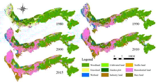 Reflecting the fact that rapidly urbanised coastal zones are greatly affected by human activities, artificial surfaces rapidly become the main land cover type in these areas. Land cover data from 1980, 1990, 2000, 2010 and 2015 were used as the basis for human interference assessment. Partial time series (1990, 2000 and 2010) came from the 30 m landcover dataset provided by the project ‘National Change in Ecological Environment over a Decade (2000–2010) Remote Sensing Survey and Assessment’ [34]. In 1990 and 2000, the land type classification accuracy of this data was 85% [35], and the land type classification accuracy of this data at level I in 2010 was 86% [36].