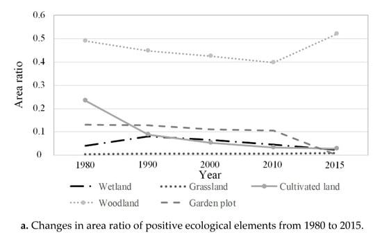Among the positive ecological elements (Figure 4a), the proportional area of wetlands and grasslands changed little, and this area was small. Wetlands decreased from 0.04 (1980) to 0.02 (2015), and the grassland increased from 0.004 to 0.008. The proportional area of cultivated land declined continuously from 1980 to 2015 (0.23 to 0.02). The proportional area of woodlands decreased slowly and continuously from 1980 to 2010 (0.48 to 0.39) but increased to 0.52 from 2015. The increased woodland area was mainly located in coastal areas (mostly mangroves). The area ratio of the garden plots decreased slowly from 1980 to 2015 (0.13 to 0).