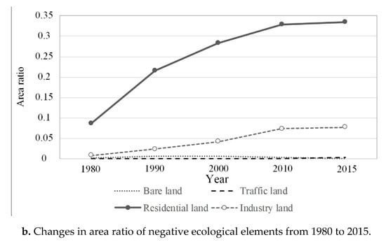 Based on the analysis of the negative ecological elements (Figure 4b), the proportional area of bare land and roadways was small and showed little change, with a decrease by 0.001 and increase by 0.003 respectively across 35 years. The proportional area of residential land increased the most, from 0.086 in 1980 to 0.334 in 2015, and it was the largest growing land cover type in the process of coastal urbanisation. In detail, there were three stages: a rapid growth period (growth 0.129) in 1980–1990, a sustained growth period (growth 0.113) in 1990-2010 and a stable period (growth 0.005) in 2010-2015. The growth of the industrial land could also be divided into three periods: a rapid sustained growth period in 1980-2000 (0.008 to 0.042), an accelerated growth stage from 2000 to 2010 (increased 0.031) and a stable period in 2010-2015 (0.073 to 0.077), which reflects the transformation of the city from an era of industrialisation to science and technology.
