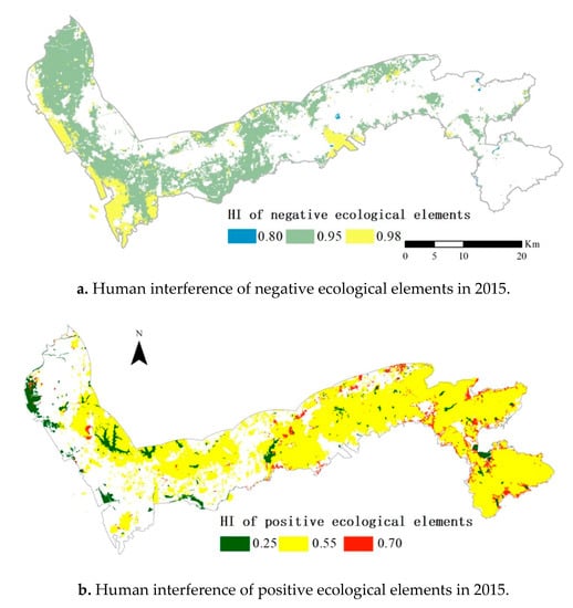 Different types of human activities with different ecological values show different spatial distribution patterns (Figure 5a,b). After comparing and analysing the spatial distribution of human interference for both negative and positive ecological elements in the study area in 2015, we found that negative ecological factors were relatively concentrated in the western part of the coastal zone, showing a strong spatial aggregation effect. The interference indices for the residential, industrial and roadway areas were high, at 0.95, 0.98 and 0.95, respectively. Most of these land cover types have continuous distributions and therefore cause wide range destruction. Positive ecological elements were relatively concentrated in the east and inland areas of the west. The interference index of cultivated land was calculated at 0.70, but the distribution was sporadic and discontinuous. The development of the city on the eastern coast is influenced by geomorphology and other factors, so the positive ecological elements in this area were relatively concentrated and mainly woodland (interference index: 0.55). As a result, the interference index is small and the ability to withstand the impact of human activities is strong. However, the positive ecological elements on the west coast were scattered, of which the main types were wetland and grassland, with interference indices of 0.25 and 0.55, respectively. The intensity of interference in the west is stronger than that in the east, and interferences from human activities are greater.