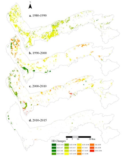 4.3. Dynamic Change in Human Interference (1980 to 2015)