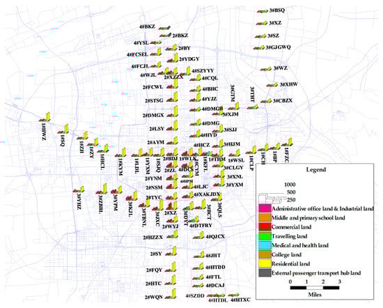The object of this study is the 88 metro stations in Xi’an, China. It should be noted that the station names consist of two parts. The first component is the number of the line that the station belongs to, so for example, 1# represents Line 1, and the number of the transfer station is the line that was operated earlier. The second part is the initials of the station name. The data includes: 1) The location of metro stations in Xi’an and whether the station is a transfer station or not, according to information collected by the Baidu coordinate pickup system in 2018; 2) The automatic fare collection system (AFC) credit card data of the Xi’an metro in March 2019, provided by Xi’an Metro Co., Ltd.; 3) Land use and building density around stations, which were collected using Baidu Maps. The land use of Xi’an metro stations is shown in Figure 1.