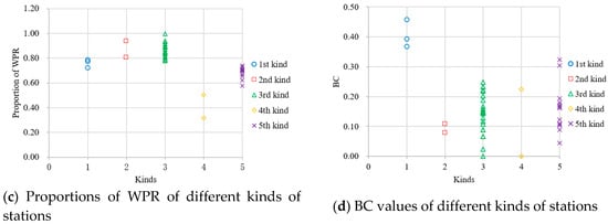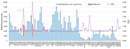 If the proportion of WPR of a station is greater than 0.5, it can be considered that the ridership during the city’s peak hour is the highest ridership of the whole day; if it is less than 0.5, the highest ridership is the ridership during the city’s peak hour multiplied by the PDC. This result is consistent with the findings of Yu [41], who examined two cities—Xi’an and Chongqing—and found that the PDC value of most metro stations is close to 1 when the proportion of WPR is greater than 0.5.