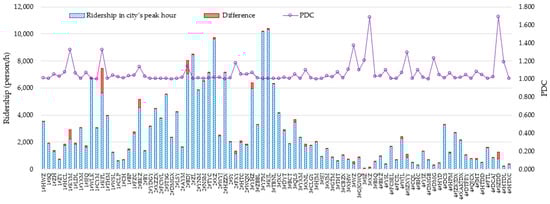 In this study, the boarding and alighting PDC values in the morning were calculated separately. PDCb denotes the boarding PDC, and PDCa denotes the alighting PDC; both are dependent variables. The boarding and alighting ridership in a city’s peak hour, the difference between ridership during a station’s peak hour and the city’s peak hour, and the PDC values of Xi’an metro stations in the morning are presented in Figure 5 and Figure 6. Most PDC values are near 1, indicating that these stations’ peak hours align with the city’s peak hour. However, there are also some stations with a PDC value greater than 1, and some with a PDC value even greater than 1.4. Table 1 presents the morning and evening PDC values of 52 stations of Chongqing metro lines 1, 3, and 6 [41]. It can be seen that although most PDC values are in the range of 1–1.2, 7.69% and 13.46% of stations’ morning and evening PDCs, respectively, are found to be greater than 1.2. Thus, the phenomenon of the ridership of a metro station during a city’s peak hour not always being the same as that during a station’s own peak hour is not a unique case in Xi’an. For the sake of the meticulous design and sustainable development of metro systems, it is important to study the PDC.