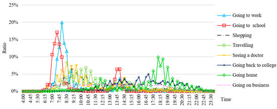 The proportion of the commuting area refers to the proportion of land area that can generate commuter travel to the total land area. According to a 2015 resident travel survey in Xi’an, the city’s peak hours are 7:30–8:30 in the morning and 18:00–19:00 in the evening. The temporal distribution of trip purposes is presented in Figure 7. The peak hours of going to work, going to school, and going home fall within the city’s peak hours; however, the peak hours of other purposes do not fall within the city’s peak hours. In particular, the land for education consists of two kinds of land, namely land for primary and middle schools and land for colleges, which both generate different passenger flows. Most primary-and-middle-school students go to school and go back home every school day, and the temporal distribution of their trip is labeled “Going to school” in Figure 7. Other scholars have also found that home-based school trips are another important part of morning-peak ridership [43], and this peak hour falls within the city’s peak hours. However, most college students live and learn at their schools, and only leave occasionally. When they return, their destinations are their colleges, and the temporal distribution is labeled “Going back to college” in Figure 7. Thus, in this paper, the land areas for work, primary and middle schools, and residences (WPR) are used as the commuting area. The proportion of WPR refers to the sum of the land areas for work, primary and middle schools, and residences, which is then divided by the total land area around the station.