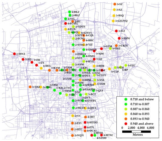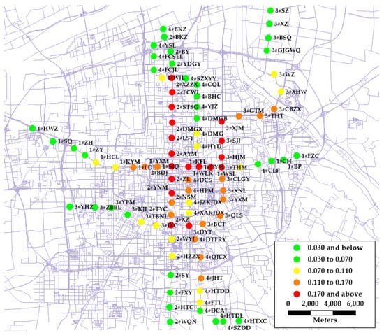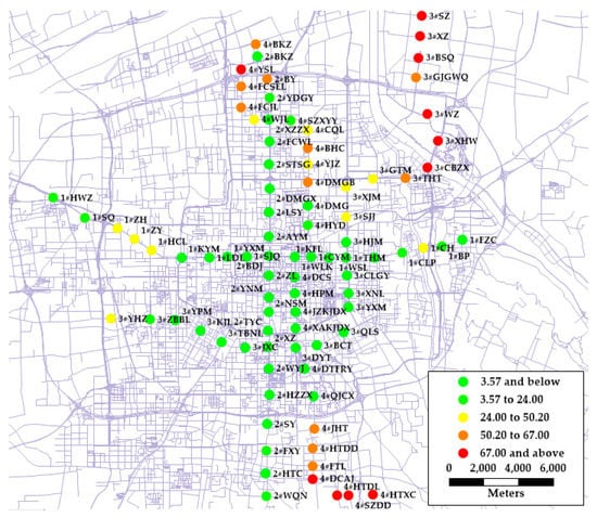 The spatial distribution of the BC values of Xi’an metro stations is presented in Figure 10.