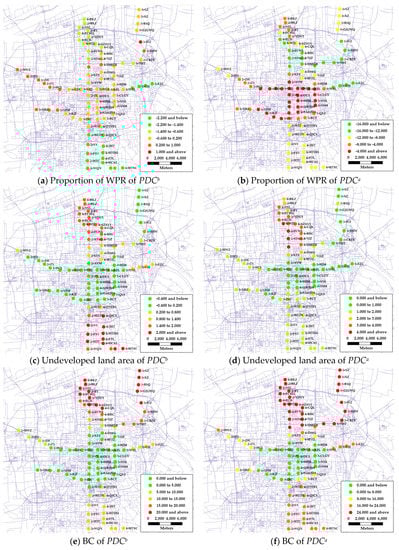 For the undeveloped land area, the range of the PDCa values is slightly larger than that of the PDCb values. The spatial distributions are approximately the same, and the larger values occur in the periphery. By comparing Figure 9 and Figure 11c,d, it is clear that there are few stations in Metro Line 2 (the north–south line) that have undeveloped land, but the regression coefficients are substantially different. For the stations in the southeast and northeast of the city with large undeveloped land areas, the regression coefficients are still substantially different. This indicates that undeveloped land areas have uncertain influences on both the PDCb and PDCa values, which is consistent with the fact that trips to undeveloped land occur relatively seldom.
