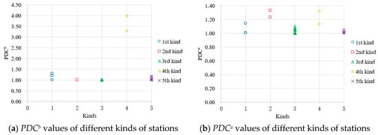 It can be determined from Figure 5 and Figure 6 that, when the PDC is large, there may be two conditions. The first condition is that the difference between the ridership during a station’s peak hour and the city’s peak hour is very large compared to that of other stations, such as is the case for 1#KFL and 2#BKZ. The second condition is that the difference between the ridership during a station’s peak hour and the city’s peak hour is small compared to that of other stations, but the station ridership itself is small, and as a result the PDC becomes large, such as is the case for 3#WZ and 4#SZDD.