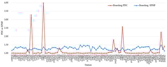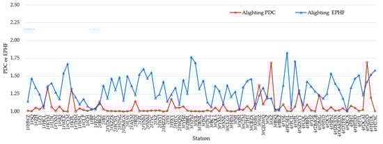 The morning boarding and alighting PDC and EPHF values of Xi’an metro stations are shown in Figure 13 and Figure 14. The fluctuations of the PDC and the EPHF values are different. For the boarding ridership, the EPHF values change from 1.1 to 1.5, while most PDC values are about 1.0. However, five stations’ PDC values are greater than 1.8, and nine stations’ PDC values are greater than their EPHF values. For the alighting ridership, the EPHF values change from 1.0 to 1.8, while most PDC values are about 1.0, but fifteen stations’ PDC values are greater than their EPHF values. Therefore, the size relationship between the extra peak hour passenger flow during a city’s peak hour and the ridership during a station’s peak hour cannot be determined. If only one kind of coefficient is used to design the station, the scale of some of the station will be small. Thus, when a station is designed, both types of ridership (the extra peak hour ridership during a city’s peak hour and ridership during a station’s peak hour) must be calculated, and the larger of the two is used to design the station.