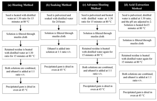 Flowchart of different sesbania seed gum (SSG) extraction methods, (a) heating, (b) soaking, (c) advance heating, and (d) acid extraction.