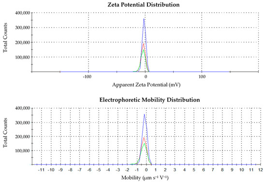 The strength and the application of the biopolymer are greatly affected by the zeta potential (ZP) and electrophoretic mobility (EM). ZP and EM analyses were carried out too and the results are shown in Figure 2. SSG was found to be a weak anionic biopolymer with −3.02 mV of ZP and −0.24 μm s−1 V−1 cm. The triplicates result showed it was consistent (Figure 2). As the surface charge of SSG is slightly negative, the main mechanism governing the flocculation is suggested to be adsorption and neutralization. During the coagulation–flocculation process, SSG helps in the adsorption and bridging of the polymers with the colloids to increase the size of the floc produced. This ability is attributed to the long-chain properties of the polymer. The polymer chains are adsorbed on the surface of the particle through chemical bonding or physical attachment and, thus, larger floc is formed. In addition, the mechanism of adsorption occurs through hydrogen bonding between the oxygen atoms associated with hydrated metal ions at the surface of the particle [31].