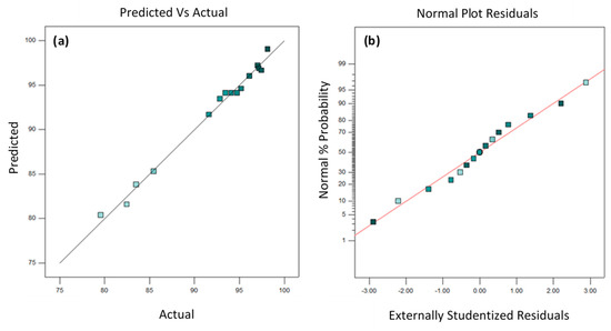 Diagnostic plots help to visualize the model adequacy and ensure the correlation between the predicted and experimental results [37,38]. For predicted vs. actual diagnostic plots (Figure 3a), the data lie near the straight line, indicating that the designed model is capable of predicting the optimal condition of each designed influencing factor to achieve desired turbidity reduction. A normal probability plot is designed to detect nonnormality and provide a quick way to visually inspect if the pattern of residuals follows a normal distribution [39]. The normal probability plot of the residuals should approximately follow a straight line. As shown, a linear pattern of probability plot is observed in Figure 3b. This result indicates that the normal distribution appears to be a good model for the data obtained. Therefore, this result has further proven the reliability of the designed model.