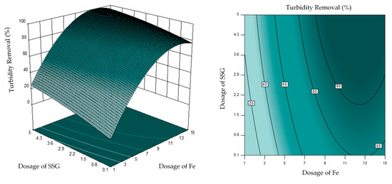 Based on the sum of squares when SSG was used as a coagulant aid (Table 5), the highest contribution effect toward turbidity reduction was the linear terms, followed by the quadratic term and the interaction term. For turbidity reduction, the total contribution of the linear, quadratic, and interaction terms were 74.10% (70.65% from the dosage of Fe, 2.36% from the dosage of SSG, and 1.09% from the settling time), 25.47% (24.72% from the quadratic effect of dosage of Fe, 0.19% from the quadratic effect of dosage of SSG, and 0.56% from the quadratic effect of settling time), and 1.03% (0.10% from the dosage of Fe and dosage of SSG, 0.25% from the dosage of Fe and settling time, and 0.67% form the dosage of SSG and settling time), respectively. This result reveals that the turbidity reduction is mainly affected by the individual effect of the influencing factors, and shows a good agreement with the 3D surface result (Figure 4), where the FeCl3 had the highest effect on the turbidity reduction. This is attributed to the role of FeCl3 as a coagulant. FeCl3 as a coagulant helps to destabilize the colloidal particles through the charge neutralization and promotes the formation of floc through the attraction of opposite charge particles. Consequently, the particles attract to each other due to the opposite-charge attraction and the disappearing of the electrostatic repulsion force between the particles. Therefore, the increase of FeCl3 dosage enhanced the turbidity reduction, until it reached an optimal point of 10–12 mg/L, after which additional dosage of FeCl3 reduced the turbidity reduction, as shown in Figure 4. This was caused by the repulsive force that formed between the colloidal particles in river water due to the accumulation of positive charges on the particle surface [40]. On the other hand, overdose leads to the destabilization of the particles and the agglomerated particles will be suspended in the water and, therefore, are hard to remove by the gravity settling. Apart from coagulant, SSG as coagulant aid plays a significant role in turbidity reduction. During the coagulation-flocculation process, the SSG and colloidal particles are adsorbed onto each other during the particle stabilization process. A complexes structure will form after, which would bridge two or more colloidal particles to form a bigger floc before settling [29]. Moreover, the increase SSG’s dosage enables more biopolymers to form larger flocs with colloidal particles in river water for effective sedimentation. This also explained the fact where designed settling time (1–15 min) does not significantly impact to the turbidity reduction. When larger and denser flocs formed, majority of the flocs settled within one minute. The result reveals the advantage of using SSG as coagulant aid, which the settling time of the flocs can be significantly reduced.