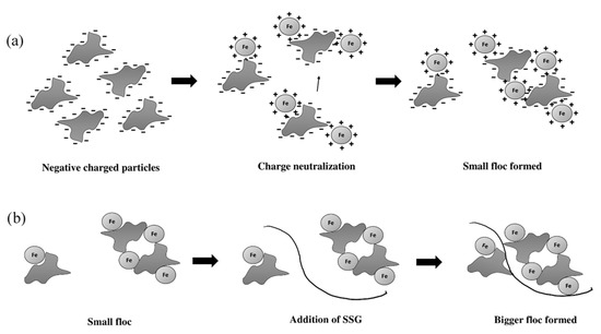 The governing coagulating–flocculating mechanisms developed by using SSG as a coagulant aid for the water treatment process are illustrated in Figure 5. When ferric chloride is added into water, Fe3+; ions are released due to the dissociation of the coagulant. The strong, positively charged metal ions strongly are adsorbed on the surface and neutralize the surface charge of the particles adsorbed onto the surface of the colloidal particle in the water, neutralizing the surface charge during the rapid mixing (Figure 5a). Consequently, small flocs are formed due to the absence of electrostatic repulsion force. This process is further facilitated by SSG bridging and adsorption of microaggregates, as shown in Figure 5b. The SSG polymers form a bridge between both particles by simultaneously capturing and binding particles to their surface. Moreover, the SSG and colloidal particles are adsorbed onto each other during the particle stabilization process. A complex structure will form after, which would bridge two or more colloidal particles to form a bigger floc before settling. Further, sufficient concentration of ferric ions contributes to the bridging process by providing sufficient charge to the particles. In the optimum concentration of FeCl3 and SSG, the effects of charge neutralization and the bridging are the strongest. The SSG may adsorb on the surface through hydrogen bonding interaction between oxygen atoms associated with hydrated metal ions at the surface of the particle [31]. Additionally, the electrostatic attraction between the SSG (negatively charged) and ferric ions (positively charged) helps in enhancing the adsorption of the particles.