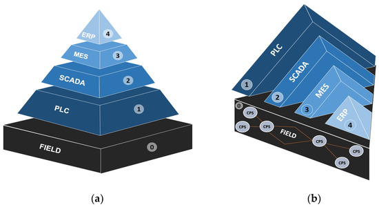 Similarly, the integration of smart and digital (I4.0-based) technologies in manufacturing plants inspired the definition of new terms such as “Smart Manufacturing” and—within company boundaries—“Smart Factory” [3]. Together, all these technologies are changing the classic approach of industrial processes supporting the storage, transportation, and transformation of raw materials into useful products. Therefore, the International Standards of Automation set of standards (ISA-95) [14]—containing all the commonly agreed definitions of the automation pyramid’s layers—must also evolve (see Figure 1, below). However, this evolution through I4.0 technologies can maintain the old pyramid intact by acting on the ways different layers can interact, gather information from the field, and store data [15,16,17]. This is possible thanks to the Cyber Physical Systems (CPSs) connection among the layers, allowing a more flexible pyramid exploitation.