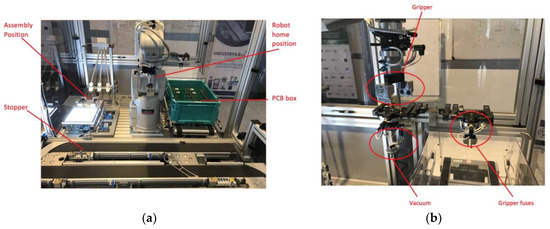 - Step 1—Manual operation: this step refers to the manual removal of back cover and fuses by an operator, by interacting with the line through a human–machine interface (HMI). Given the initial structure of the line (originally designed for assemble products), it was not possible to remove the pressed-back cover. Specifically, robot tools do not currently allow for the removal of the pressed-back cover because it is needed to fix the product on the pallet.