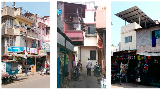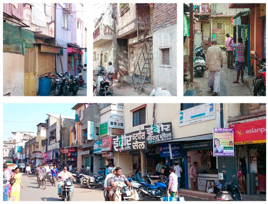 This paper draws on a case study in the Yerawada district, which is one of the largest pockets of informal settlements located in the northeast of Pune, India. The study area is a part of the Mother Teresa Nagar, a dense and consolidated settlement incorporating a mix of self-organised access networks and buildings in Yerawada. The case study selection rationale is close to what Flyvbjerg [] outlined as critical and information-oriented cases. Nonetheless, this is an evolving study with no claim that this specific case can represent the broad range of informal settlements. This is part of a broader study based on fieldwork in 2014 and 2015 []. Special events and extreme climatic conditions have been avoided during fieldwork to capture a snapshot of a typical condition. Multiple methods were adopted to explore the ways in which urban morphologies and adaptations work with a qualitative approach. Most data on building density, functional mix, access network, public-private interface, loose parts, and street-life intensity has been collected through observation. Visual recording including photography and field notes has been used as a supplementary method. Archival records including aerial photos from Google Earth have been used as well.