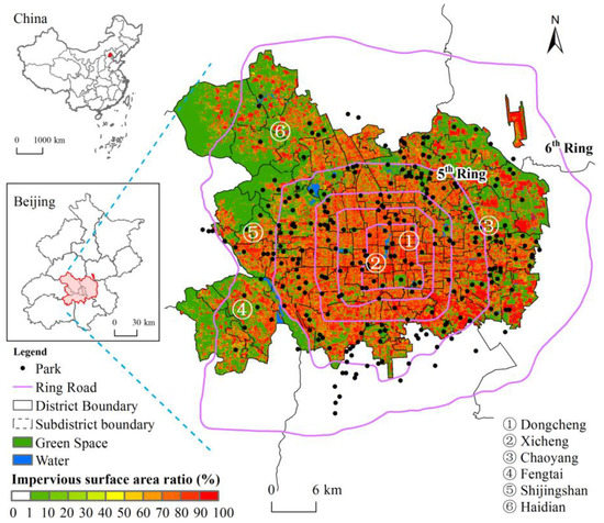 The study area is located in the Beijing metropolitan area at 39°26′ N to 41°03′ N, 115°25′ E to 117°30′ E. It occupies a total area of 1369 km2 and includes six districts—Dongcheng, Xicheng, Chaoyang, Fengtai, Shijingshan and Haidian—and 135 subdistricts or towns (Figure 1). The total population in 2018 was approximately 12.09 million, and more than 99% lived in urban areas [34]. Since the implementation of China’s reform and opening-up policies, Beijing has experienced a rapid urbanization process and the urbanization rate reached 86.5% in 2018. The total built-up land and impervious surface areas have increased by more than 1100 and 700 km2, respectively, in the past 40 years [35,36,37]. Dramatic increase in impervious surface and decrease of green space have intensified the urban flood risk and amount of water-logging. The climate of Beijing is temperate and monsoonal and is characterized by hot summers and cold winters. The mean annual temperature is 12 °C and the mean annual precipitation varies from 400–800 mm yr−1, of which nearly 80% occurs between June and September [21,38]. Previous studies have shown that both precipitation and annual days of rainstorms in Beijing have decreased gradually in the past 50 years [39]. However, heavy rainstorms occurred more than 20 times in the urban areas of Beijing in the past 10 years, which resulted in serious waterlogging disasters. More specifically, rainstorms occurred on 21 July 2012 and 20 July 2016, both resulting in severe water-logging and socioeconomic loss [40,41]. In 2016, Beijing was chosen as an example city to implement an idea called “Sponge City” to improve urban flood mitigation capacity and realize the goal of “no ponding under light rain and no water-logging under heavy rain.” Under these circumstances, it is necessary to evaluate UFRES to support urban green infrastructure and low-impact development planning.