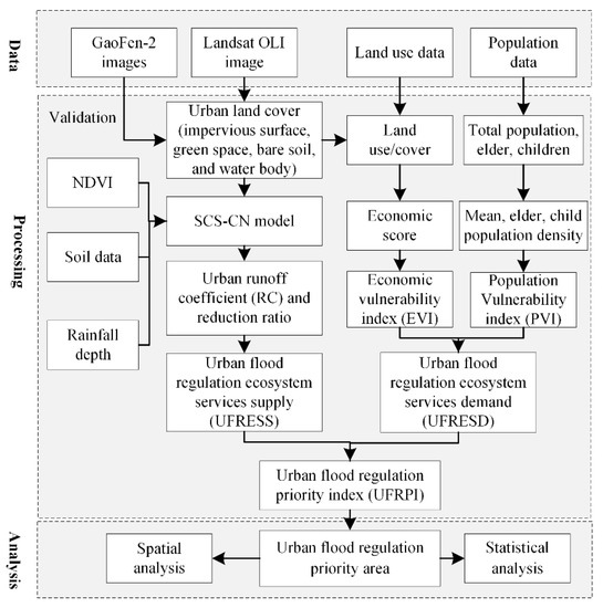 The flow chart in Figure 2 shows the procedures adopted in this study to identify urban flood regulation priority areas in Beijing. First, we collected the datasets used in this study. Second, we processed the Landsat image, land use and population data to evaluate UFRES. Third, we evaluated UFRES supply and demand by using indicators of runoff reduction ratio and urban vulnerability. Then, we calculated an urban flood regulation priority index to identified priority areas and analyzed the spatial pattern of urban flood regulation priority areas. Finally, we discussed the efficiency of the priority index and the role of urban green space in urban flood regulation.