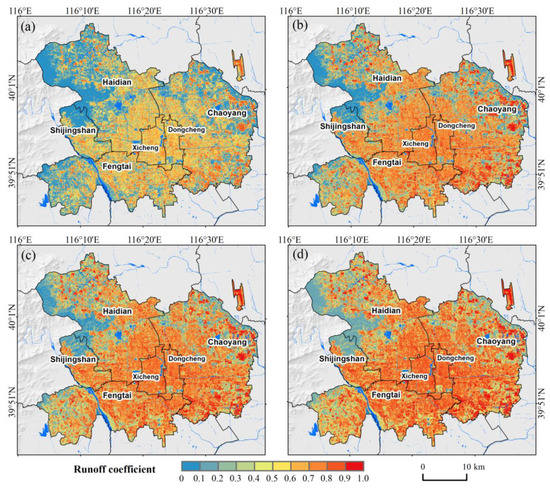 Spatial distributions of the urban runoff coefficients for 1-year (a); 10-year (b); 25-year (c); and 100-year (d) rainfall return periods.