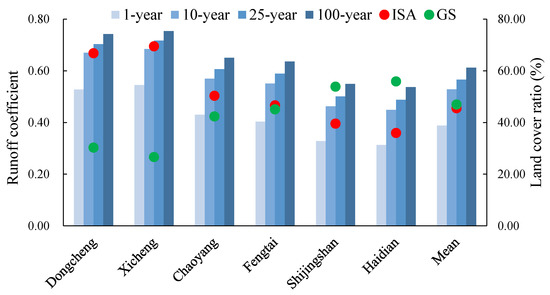 Due to different land cover compositions, the runoff coefficients varied among the six districts. It is obvious that Dongcheng District, with the highest impervious surface percentage, has the highest runoff coefficient, while Haidian District, with the highest green space percentage, has the lowest runoff coefficient (Figure 4). This result indicates that urban impervious surface and green space play opposite roles in mitigating runoff, and green space plays a positive role in regulating runoff to some extent. Under the 10-year rainfall return period, the runoff coefficient in Dongcheng District was 0.67, while the runoff coefficient in Haidian District was lower by 0.22. This is mainly because the impervious surface percentage in Dongcheng was 30.9% higher than that in Haidian (Figure 4).