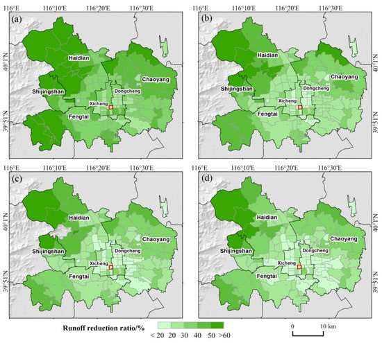 A high UFRESS value means that the existing green space in the subdistrict provides more potential UFRES. Here, UFRES supply runoff reduction capacity was evaluated under different rainfall scenarios. We used the storm intensity formula for Beijing [56] to calculate the rainfall depths of four scenarios: 39.7 mm (1-year rainfall return period), 62.4 mm (10-year rainfall return period), 72.1 mm (25-year rainfall return period), and 104.4 mm (100-year rainfall return period), and the rainfall duration was set as 120 min [50,56].