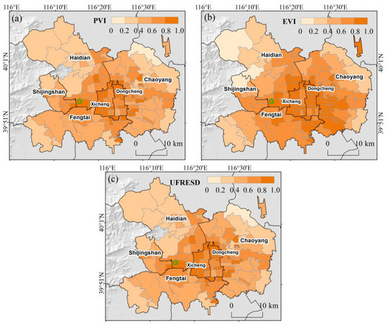 In this study, UFRESD is determined by population vulnerability and economic vulnerability. Figure 6 shows the spatial pattern of urban population vulnerability, economic vulnerability, and UFRES demand. The subdistricts with a high UFRESD are mainly located in Dongcheng and Xicheng Districts. This is mainly because the population in the central city was more concentrated than that in suburban areas, especially the proportion of minority groups (such as children and elders) (Figure 6a). More specifically, the top 10 subdistricts that demand the most UFRES also have a large number of children and elders, and their occupancies are higher than 15% each. Meanwhile, the subdistricts with low UFRESD were mainly distributed in the northwestern part of Haidian District and the northeastern part of Chaoyang District, where population density was low and natural land accounted for over 80% of the total area. Yongding-Road Subdistrict (Figure 6) had the highest UFRESD value, mainly due to its high population density (49,346 persons/km2), high proportion of elderly people (15.86%), and high impervious surface ratio (78.42%).