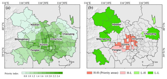 In this study, we calculated UFRPI by integrating UFRES supply and demand. In general, the mean UFRPI of the study area was 1.54; Xicheng and Shijingshan had the highest value (1.98) and the lowest value (1.33), respectively. Spatially, urban flood regulation priority decreased with increasing distance to the urban center. The subdistricts with high priority values were mainly located in Dongcheng and Xicheng Districts. While, the subdistricts with low priority values were mainly distributed in northwestern Haidian District and northeastern Chaoyang District, where urban flood regulation supply is high and flood regulation demand is low (Figure 7a).