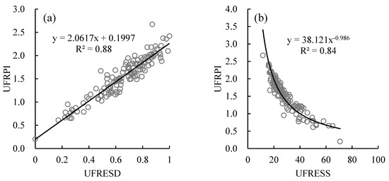 Scatter plot diagram and linear relationship between UFRPI and UFRESD (a); scatter plot diagram and non-linear relationship between UFRPI and UFRESS (b).