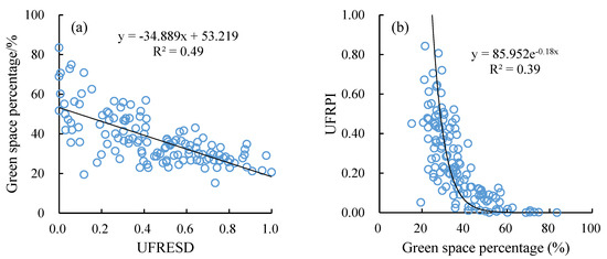 The relationship between urban green space percentage and (a) the demand for urban flood regulation ecosystem services (UFRESD), and (b) the urban flood regulation priority index (UFRPI).
