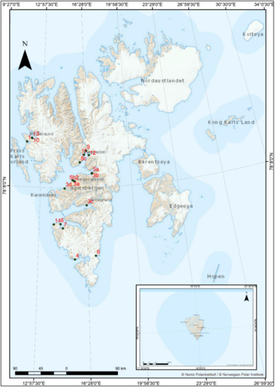Distribution of studies dealing with coastal erosion in Svalbard (red numbers correspond to numbers from Table 1, column 1) (base map from Norwegian Polar Institute) [66].