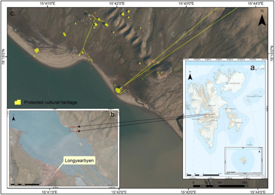 (a). Geographical location of the study area in the context of Svalbard; (b) Local context; (c) Location of the protected cultural heritage (base orthophoto from Norwegian Polar Institute) [66].