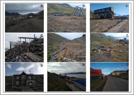 (a) Former coal-mining infrastructure in Longyearbyen; (b,c) Former coal-mining infrastructure in Hiorthhamn; (d–f) Remains of the coal-mining exploitation in Svea; (g–i) Current images from the Russian coal-mining city of Barentsburg.