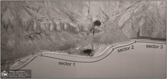 The south-eastern Sector 3 of the study area forms a long erosional escarpment through a raised abandoned alluvial fan–delta [86]. Wave action forms the steep escarpment by undercutting the raised delta sediments. Slumping of primarily sandy sediments in the over-steepened escarpment moves sediments down to the beach (Figure 7d) where they are moved into the sea and further eastwards by wave action and long-shore transport. The shoreline displacement between 2009 and 2019 (Figure 6) clearly highlights the shoreline retreat resulting from the undercutting and erosion.