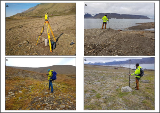 (a) Total station and controller on one of the fixed points; (b) Coastline survey; (c) Geological mapping of the upper area of Hiorthhamn; (d) Survey of surface soil movements.
