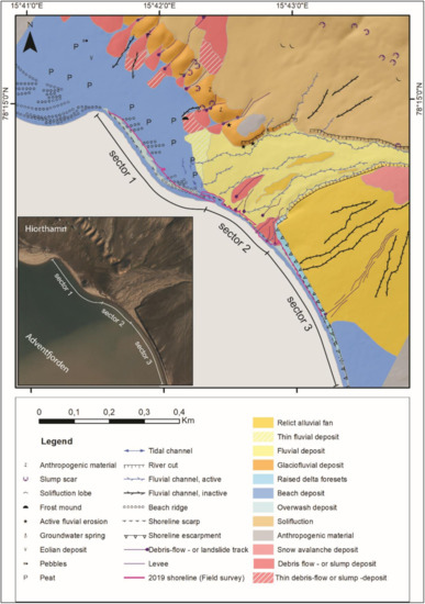 Coastal areas located at high latitudes are even more affected by the changes in the environment (e.g., air temperatures, major river discharges and open water season length have increased, and storm tracks and intensities are changing) [6]. The Arctic coastal zone is defined as the region both seaward and landward of the coastlines of the Arctic shelf areas, including all archipelagos and islands [7]. Arctic coastal areas can experience erosion rates similar to or higher than those in temperate regions due to the added influence of thawing permafrost and extreme temperatures, even though the erosional processes are usually still limited to a few months per year [6]. Arctic areas have become important hot spots for studying the effects of a changing climate [8], which is felt earlier there than elsewhere on Earth [9]. The present ongoing research focuses on modelling the velocity of glaciers and ice caps [10], land cover and ice-wedge polygon mapping [11,12], the surface morphology of fans [13], retrogressive thaw slumps triggering [14,15], coastal erosion [16], human impact [17], etc. One of the most exposed Arctic areas is Svalbard, which is experiencing amplified climate change when compared to the global average [18,19]. Svalbard’s coastal area is under high pressure from natural [20] and in some area’s anthropogenic changes [21,22].