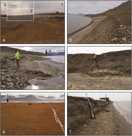 Coastal areas of seas and oceans are among the most dynamic landforms and are permanently under threat of change from natural processes and anthropogenic pressure. A significant proportion of the world’s population, at present and throughout history, lives in coastal areas (between 15% and 40%), which are under the direct effects of climatic change-related [1,2] processes such as sea-level rise [3] and changes in the intensity and frequency of storms [4]. Over the last decades, coastal areas have been subjected to increased rates of erosion [5], and this will most likely cause significant economic losses in the future. Arctic coastal areas can experience erosion rates similar to, or higher than, those in temperate regions due to the added influence of thawing permafrost and extreme temperatures.