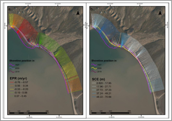 Using the DSAS analysis of the coastline, the following parameters were computed EPR (Figure 8a), SCE (Figure 8b). EPR shows the highest rates between the oldest (1927) and the most recent (2019) shoreline in the northwestern part of our area of interest. The shoreline from 2009 was not included in the analysis and is shown in Figure 8a only for orientation purpose.