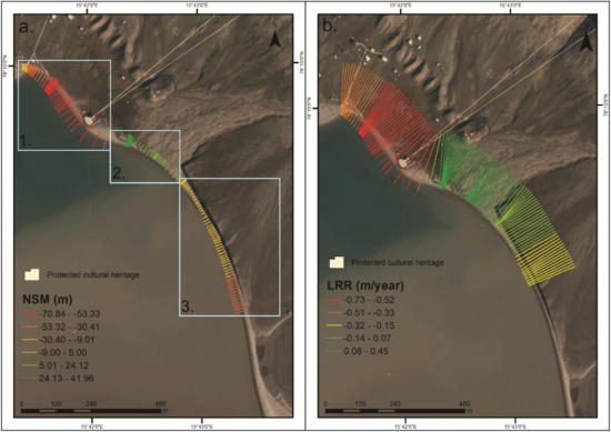 Hiorthhamn is an abandoned Norwegian coal mining settlement with a loading dock and a lot of industrial infrastructure left in the coastal zone. In this study, changes in the position of 1.3 km of the Hiorthhamn shoreline, which affect cultural heritage, is described for a time-period spanning 92 years (1927–2019). The shoreline positions were established based on a map (1927), orthophotos (2009) and a topographic survey with differential Global Positioning System (GPS) (summer 2019). Detailed geomorphological and surface sediment mapping was conducted to form a framework for understanding shoreline-landscape interaction. The shoreline was divided into three sectors to calculate the erosion/stability/accretion rates by using the DSAS (Digital Shoreline Analysis System) extension of ArcGIS. The DSAS analysis showed very high erosion in Sector 1, while Sectors 2 and 3 showed moderate accretion and moderate erosion, respectively. Sector 1 is geologically composed of easily erodible sorted beach sediments and protected remains from the mining industry such as wrecks of heavy machines, loading carts, wagons and rusty tracks that are directly exposed to coastal erosion. The all-sector average shoreline erosion rate (EPR parameter) for the 92 years period was −0.21 m/year. The high shoreline erosion rates in Sector 1, together with the high potential damage to cultural heritage, supports the urgent need of continued coastal monitoring and sustainable management of cultural heritage in Hiorthhamn.