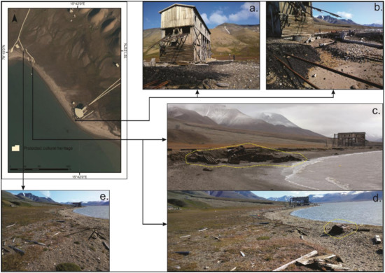 Today the former mining settlement is the second largest gathering of listed buildings at Svalbard (next to Ny–Ålesund) and is considered an important cultural heritage site. The listed historic site counts a total of 13 standing buildings and remains from mining infrastructure, such as cable car poles, a cable car station and railway tracks. The mine itself is situated high up in the mountain, 580 meters above sea level, and the coal was transported on an aerial cableway from the mine to the seaside. Except a few buildings up in the mountains, the whole site is situated close to the coastline, vulnerable to coastal processes [85].