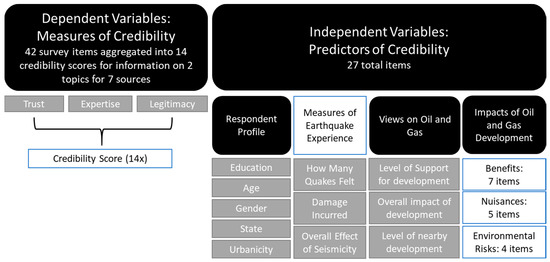 In addition to uncovering who was viewed as credible, we sought to understand what factors predicted the credibility of different information sources. Credibility is not a fixed attribute—it can change and it varies based on the audience. Credibility is relational in this sense, in that different community members have different views on the level of credibility of the same source. For instance, a university may have a certain level of credibility with one community, and another level of credibility with another community altogether. These different levels of credibility vary based upon attributes, or factors, and their relationships to sources [37,39,41]. As a result, we sought to understand how perceived credibility of sources changes based on different factors. While there are many factors and interrelationships that lead one party to “believe” another or find them credible, including what Pornpitakpan referred to as source, message, channel, receiver, and destination variables [41], a survey limits the detail in which many of these variables can be explored. Specifically, we focused on variables associated with the receiver as they relate to the source, particularly variables that can be categorized as ones of initial disposition and issue involvement. Drawing from literature and case knowledge, these included perceptions of oil and gas development, exposure to induced seismicity, demographic variables, and the location of the respondent (i.e., urban or rural).