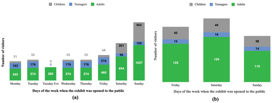 The estimated total number of visitors at the RSSSE was therefore 6287 and at Bluedot was 581 (Figure 3a,b). The ‘Take a Bite’ stand engaged with approximately 6868 people in these two events, 64% adults (20 years old and older), 16.8% teenagers (ages 13–19) and 18% children (under 13 years old). The results for the counting number showed that Sunday was the busiest day at the RSSSE, with the highest number of adults and children visiting. However, the number of teenage visitors was higher during each weekday than during each weekend day, as expected due to secondary school group visits taking place from Monday to Friday. Consequently, it is important to consider which days an event will take place, so that it reaches the largest number of people in the target audience. Furthermore, comparing the total number of visitors (RSSSE 11450, Bluedot 21,000 people), this topic has proven to be of interest to a large audience, as well as people from a variety of age groups.