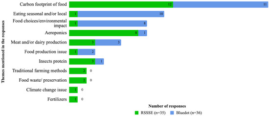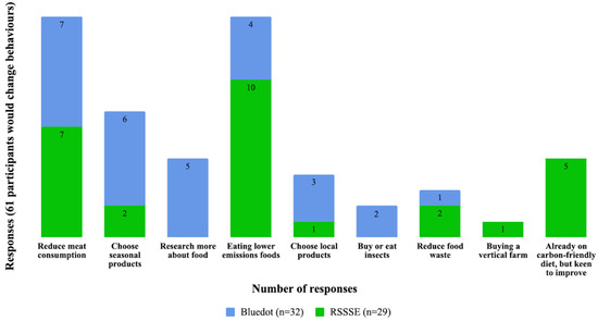 Question number three asked whether respondents are likely to change any behaviour after seeing the exhibit. Most participants said they were keen to change behaviour regarding food choices after visiting the stand (24 at the RSSSE and 27 at Bluedot), which might indicate a positive result for the activities developed. Following the above responses, individuals stated what behaviour they would change (Figure 5). In both events two main themes were observed, (1) eating food with a lower carbon footprint and (2) reducing meat consumption. Activities such as climate food flashcards and the climate food challenge are directly related to these answers, as they discuss reductions on red meat consumption, as well as the carbon footprint of different foods, and they can be used in future events to engage with people. Some of the themes were mentioned only in one of the two events, such as ‘research more about food’ at Bluedot, and ‘already on a carbon-friendly diet, but keen to improve’ at the RSSSE. This variation might have occurred due to the reduced number of questionnaires collected. It is suggested that we increase the number of responses in future events.