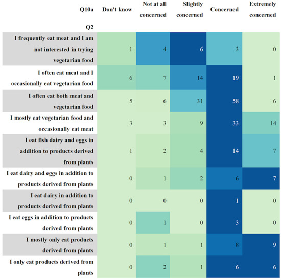 A colour-coded table that shows the relation between the type of diet people say they follow, and their level of concern for the environment. There are 312 survey responses illustrated in the figure. Vegans made up 4.5%, 95% CI (2.3%, 6.7%) of respondents, vegetarians 13.2%, 95% CI (9.4%, 17%), pescatarians 9.2%, 95% CI (6.1%, 12.3%), flexitarians 54.4%, 95% CI (47.71%, 61.1%) and meat eaters 18.8%, 95% CI (15.4%, 22.2%) of respondents.