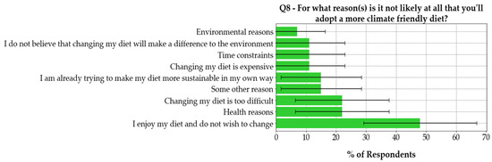 Reasons why respondents are not likely to adopt a more climate-friendly diet. In question seven of the multiple-choice online survey, 27 respondents indicated that they were ‘not very likely’ or ‘not at all likely’ to change their diet. In question eight, this subset of respondents were asked why they were not likely to change their diet—these results are shown in the figure. In the figure, 95% confidence intervals are shown.
